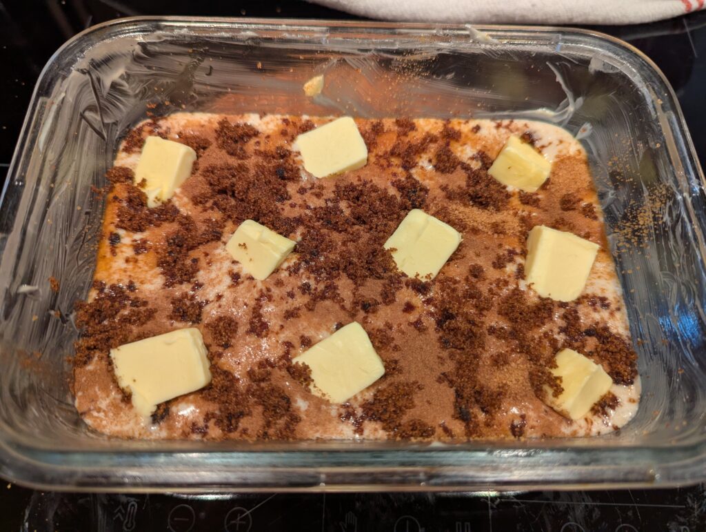- Sprinkle on a good amount of cinnamon, and top with the brown sugar. I used a mix of light and extra dark for flavor, but choose whatever you prefer.Arrange cubed butter around the top, pushing it partway down into the batter.