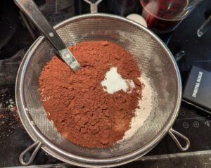 • Combine your dry ingredients in a bowl. Here, I sifted everything in through a strainer, then stirred it together well to mix.