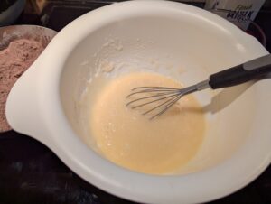 Mixing bowl with the liquid mixture, looking frothy on top